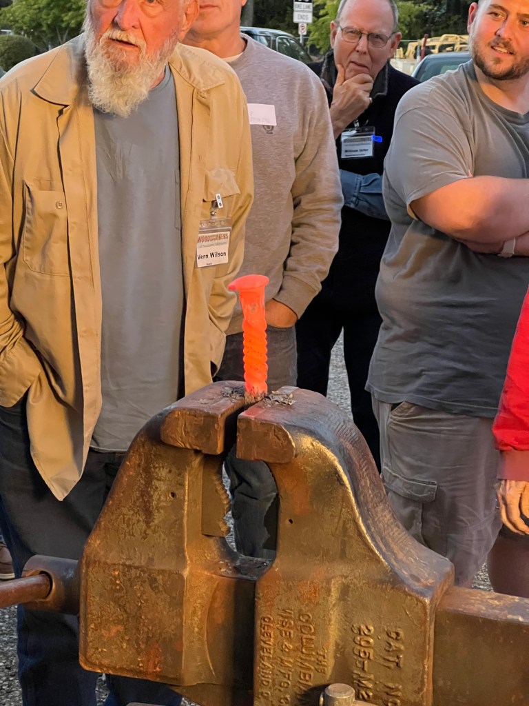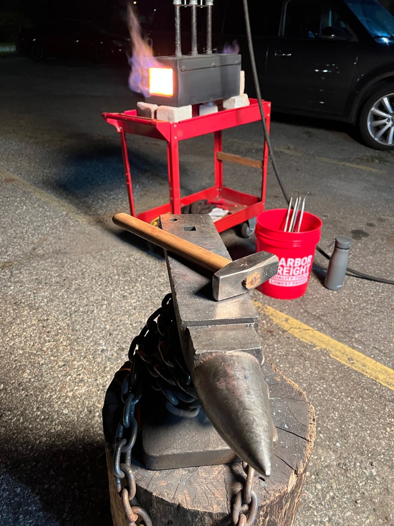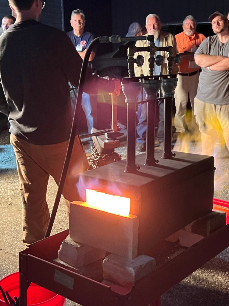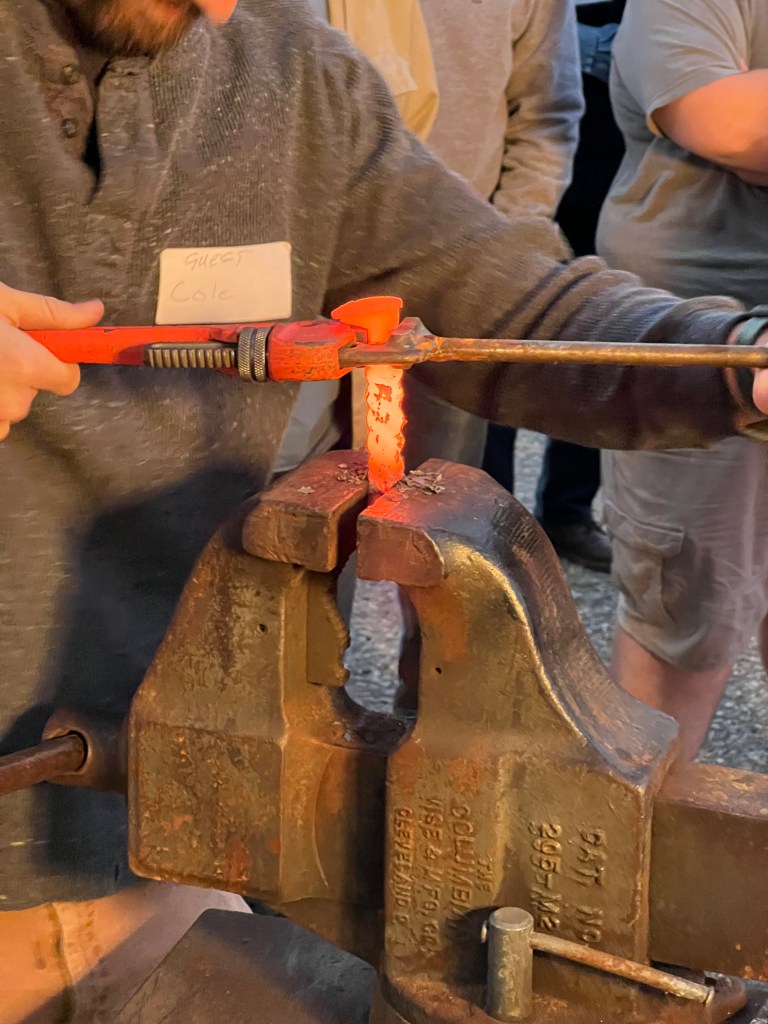 Cole, the owner of Butterhog Forge in Kalamazoo gave an excellent demonstration at our October meeting. He brought his portable forge and made a knife from a railroad tie, allowing some of our members to take a shot at it as well!